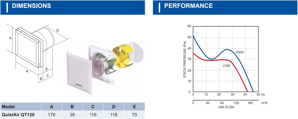 Az Airflow QT120T kiváló csendes ventilátor 120 mm-es átmérőjű, hatékony axiális impellerrel rendelkezik, amely 47 liter/másodperces légáramot biztosít. Két sebességi beállítással és automatikus indítással rendelkezik, emellett 2 perces késleltetett indítási funkcióval is felszerelt, így optimálisan használható fürdőszobákban és konyhákban. A zajszintje mindössze 32 dB, ami garantálja a nyugodt környezetet, míg az IP45 védettség víz- és porállóságot biztosít.