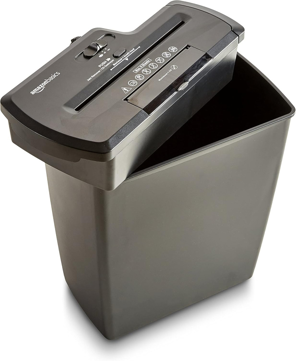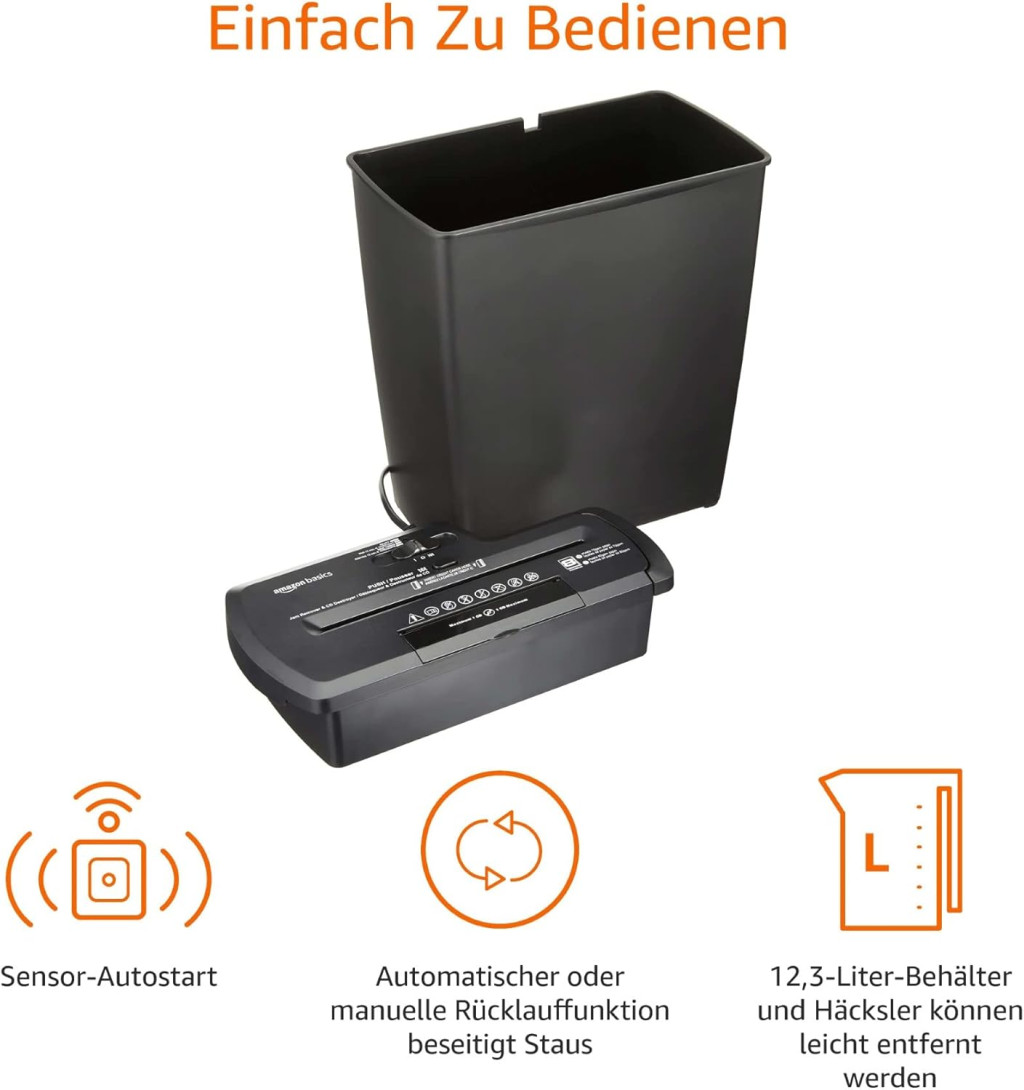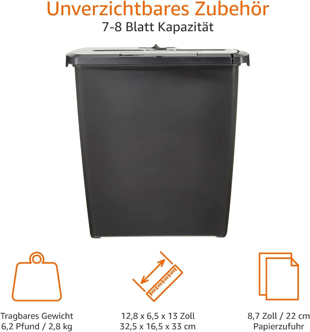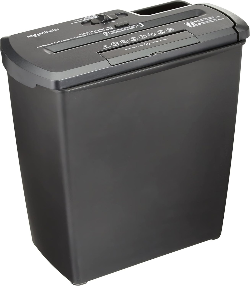 Amazon Basics PBH-55473 Csíkvágó Iratmegsemmisítő, 7-8 Lap, 12 Literes Kapacitás, CD/DVD Megsemmisítés, Fekete