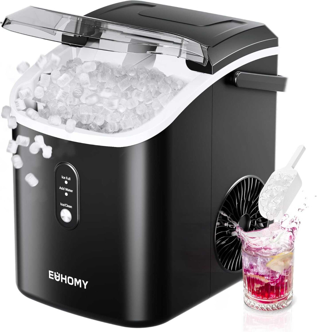 Az EUHOMY nugget jégkészítő mindössze 6–8 perc alatt friss, rágcsálható jeget készít, akár napi 15 kg mennyiségben az 1,1 L-es víztartály és a 0,82 kg kapacitású, kivehető kosár segítségével. Kompakt, kb. 24 × 30 × 33 cm-es mérete, önálló öntisztító programja és a 3 kWh/nap körüli energiafogyasztás kényelmes, takarékos használatot biztosít otthonra vagy irodába.