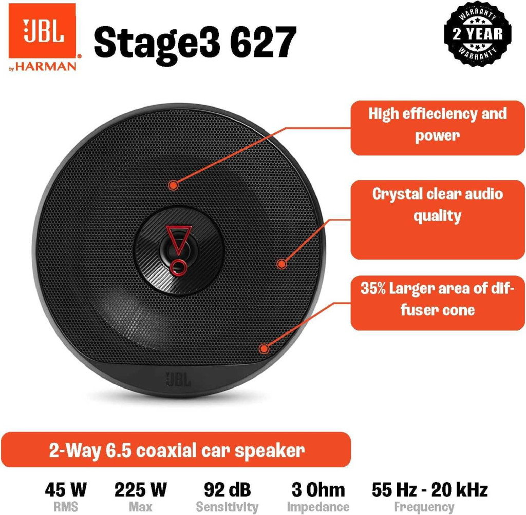 A JBL Stage 3 627 autóhangszóró készlet 225 W maximális teljesítményt, 2.0 sztereó kialakítást és 3 Ω impedanciát kínál a dinamikus, részletgazdag hangzásért. A 16 cm átmérőjű, koaxiális, polipropilén hangszóró beépíthető kivitelben, beépített magassugárzóval és Bluetooth-kapcsolattal javítja a gyári autóhifi rendszer hangminőségét.