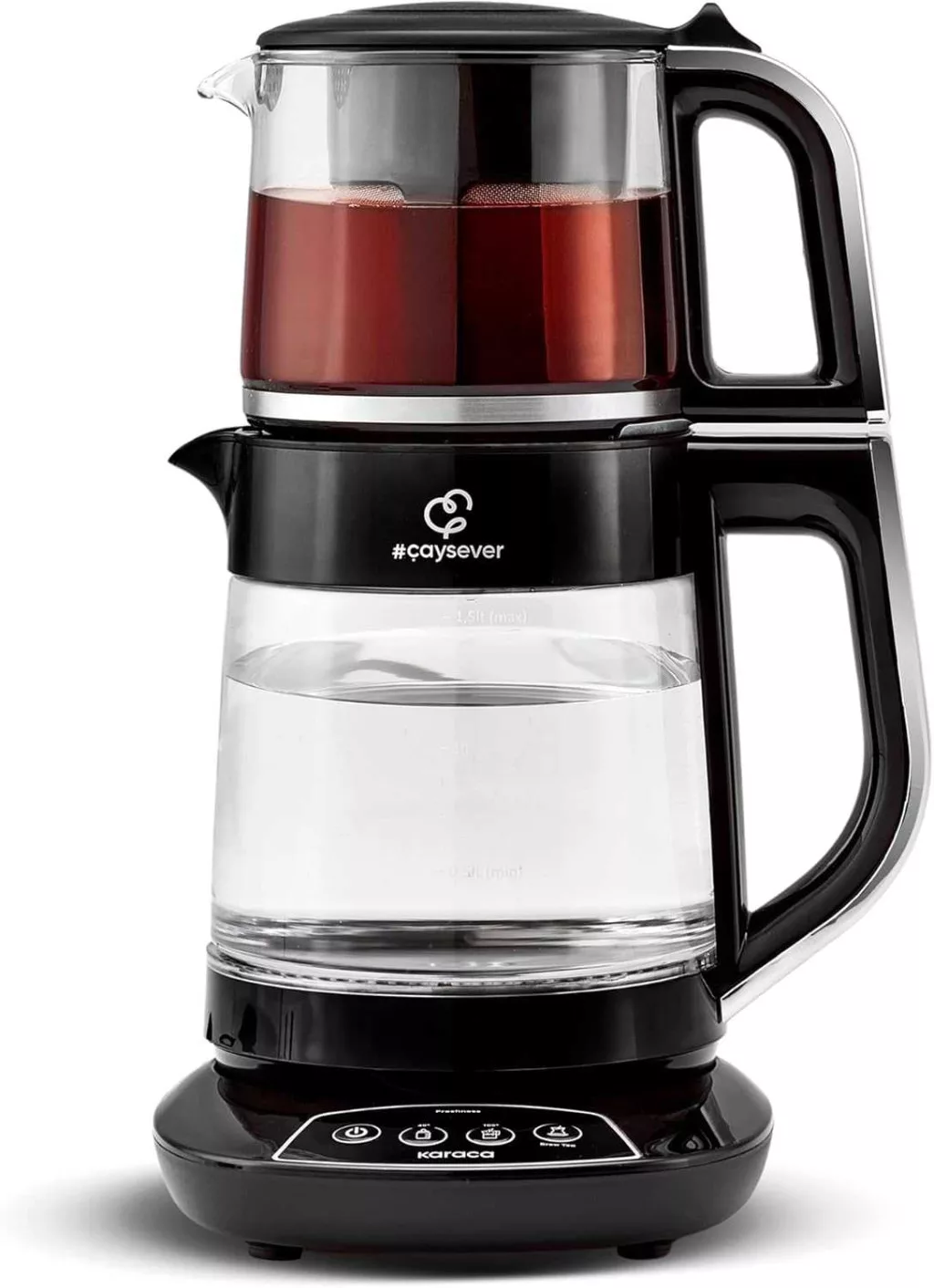A KARACA Caysever Turkish Tea Maker egy többfunkciós, 1700 W teljesítményű elektromos tea- és vízforraló, amelyet kifejezetten a kényelmes, gyors és pontos hőmérséklet-szabályozásra terveztek. A készülék 1,5 L-es intelligens vízforraló résszel és 0,8 L-es üveg teáskannával működik, így a hagyományos török tea elkészítése éppúgy egyszerű, mint a mindennapi forró italoké. Üveg és műanyag anyaghasználata, ezüstszínű kialakítása és praktikus funkciói miatt jól illeszkedik a modern konyhákba.