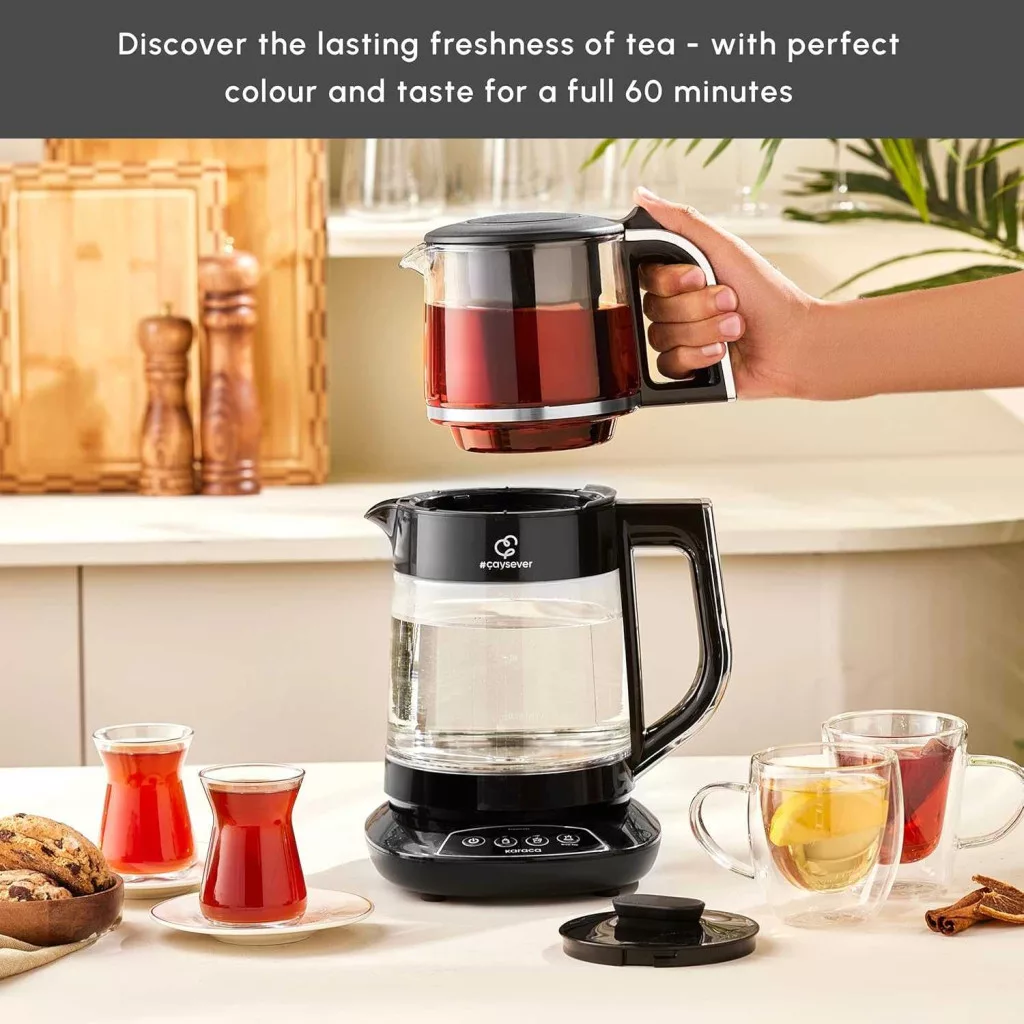 A KARACA Caysever török tea főző 1700 W teljesítménnyel és 1,5 L-es vízforralóval, valamint 0,8 L-es üveg teáskannával gyorsan felmelegíti a vizet 40–100 °C között, így a babaételtől a teáig mindent pontos hőfokon készíthetsz. A hangos visszajelzés, az automatikus kikapcsolás alacsony vízszintnél és a BPA-mentes anyagok biztonságos, kényelmes használatot nyújtanak akár 60 percig frissen tartott teával.