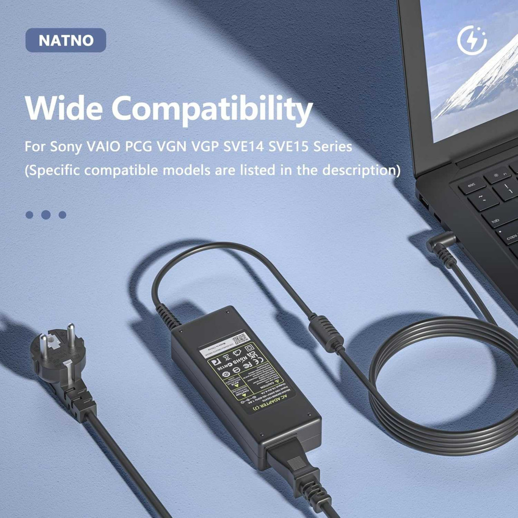 A NATNO 90 W-os, 19,5 V / 4,7 A kimenetű hálózati töltőkábel 100–240 V bemeneti tartománnyal és 50/60 Hz frekvenciával működik, 6,5 mm × 4,4 mm csatlakozóval, így számos Sony Vaio laptophoz és Sony Bravia KDL televízióhoz használható. A fekete, 2 tűs csatlakozós adapter túláram-, túlfeszültség-, túlmelegedés- és rövidzárlat-védelemmel, valamint kompakt, 13 cm × 5 cm × 3 cm méretű házzal rendelkezik.