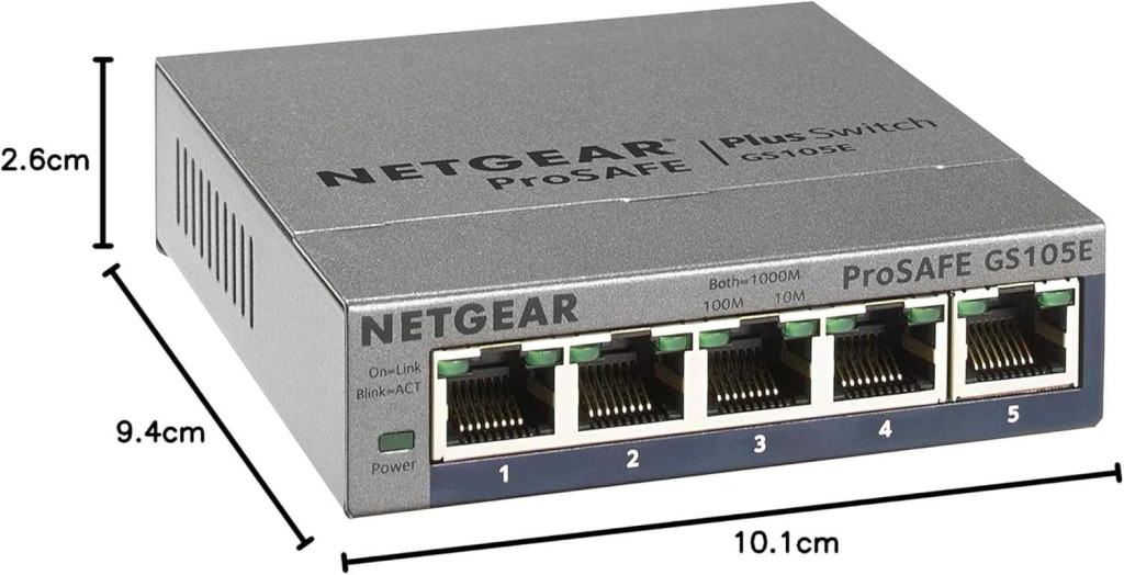 NETGEAR GS105E-200PES Smart Managed Plus Switch, 5 Gigabit Port, 10/100/1000 Mb/s, VLAN, QoS, DoS, IGMP Snooping, IEEE802.3az, Ventilátor Nélküli, Fém Ház, Szürke