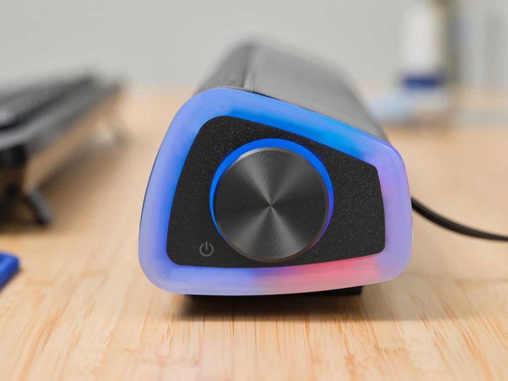A Trust Liro hangrúd színes hullám RGB LED-világítása hangulatos fényt ad a monitor alá, ami játék vagy filmnézés közben különösen látványos. Ha visszafogottabb megjelenésre van szükség, a fények egyszerűen kikapcsolhatók, így a hangrúd diszkréten illeszkedik a munkaállomáshoz. A nagyméretű előlapi tekerőgombbal gyorsan és pontosan állítható a hangerő, akár munka, akár szórakozás közben használod.